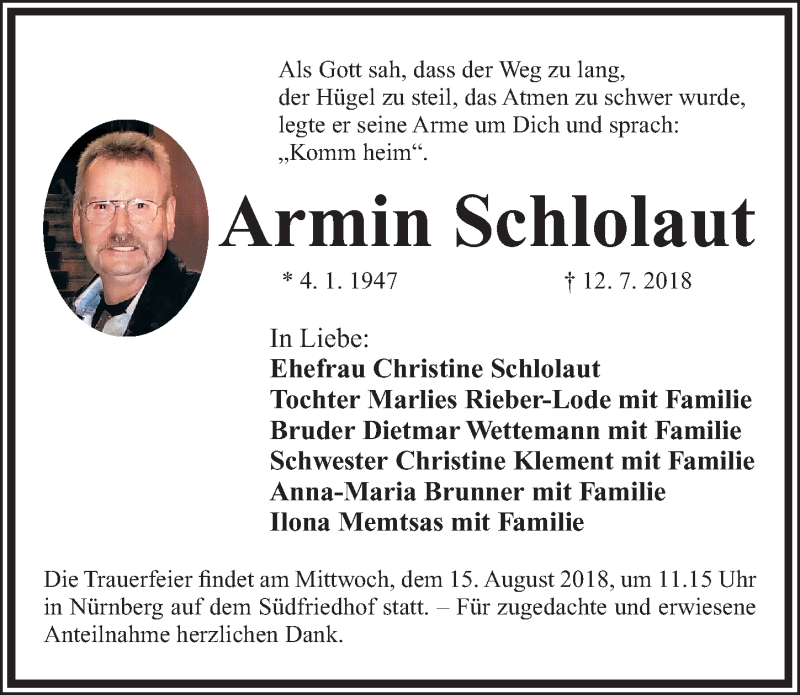 Hier finden Sie alle Traueranzeigen aus der Zeitung, die bisher für Armin Schlolaut erschienen sind. Weitere Traueranzeigen, die in der Zeitung erscheinen, werden hier ebenfalls aufgelistet