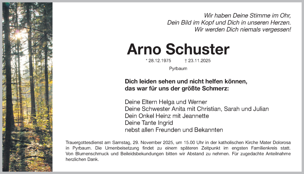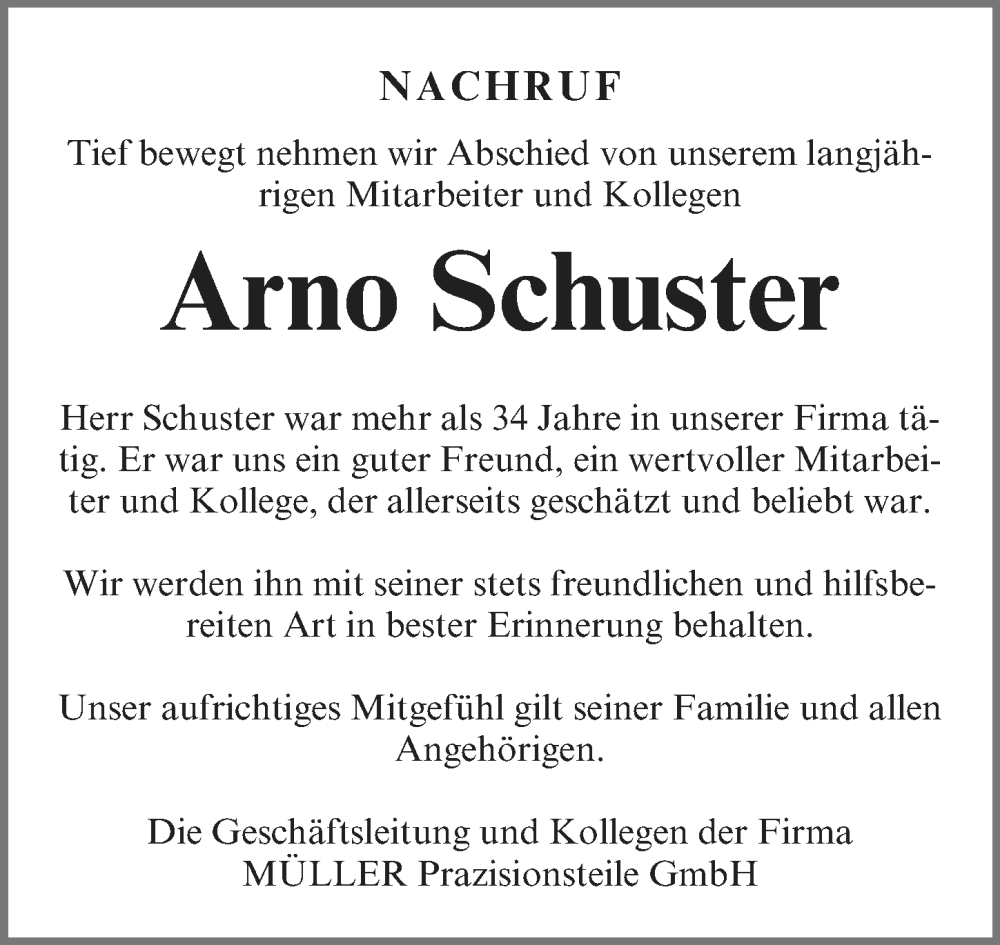 Hier finden Sie alle Traueranzeigen aus der Zeitung, die bisher für Arno Schuster erschienen sind. Weitere Traueranzeigen, die in der Zeitung erscheinen, werden hier ebenfalls aufgelistet