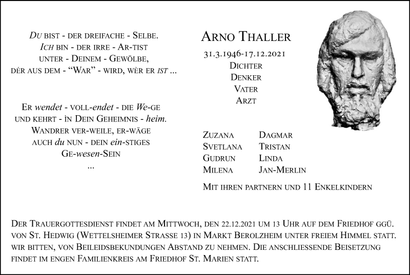 Hier finden Sie alle Traueranzeigen aus der Zeitung, die bisher für Arno Thaller erschienen sind. Weitere Traueranzeigen, die in der Zeitung erscheinen, werden hier ebenfalls aufgelistet