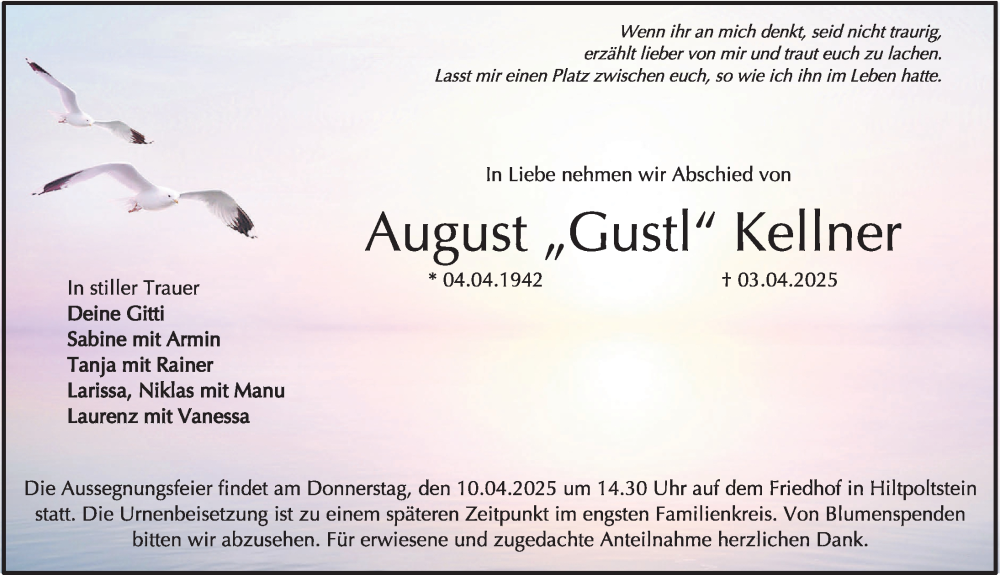 Hier finden Sie alle Traueranzeigen aus der Zeitung, die bisher für August Kellner erschienen sind. Weitere Traueranzeigen, die in der Zeitung erscheinen, werden hier ebenfalls aufgelistet