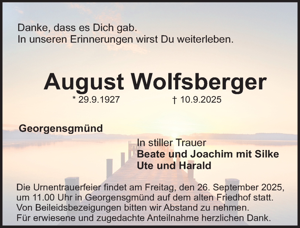 Hier finden Sie alle Traueranzeigen aus der Zeitung, die bisher für August Wolfsberger erschienen sind. Weitere Traueranzeigen, die in der Zeitung erscheinen, werden hier ebenfalls aufgelistet