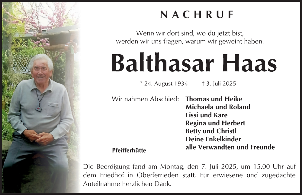 Hier finden Sie alle Traueranzeigen aus der Zeitung, die bisher für Balthasar Haas erschienen sind. Weitere Traueranzeigen, die in der Zeitung erscheinen, werden hier ebenfalls aufgelistet