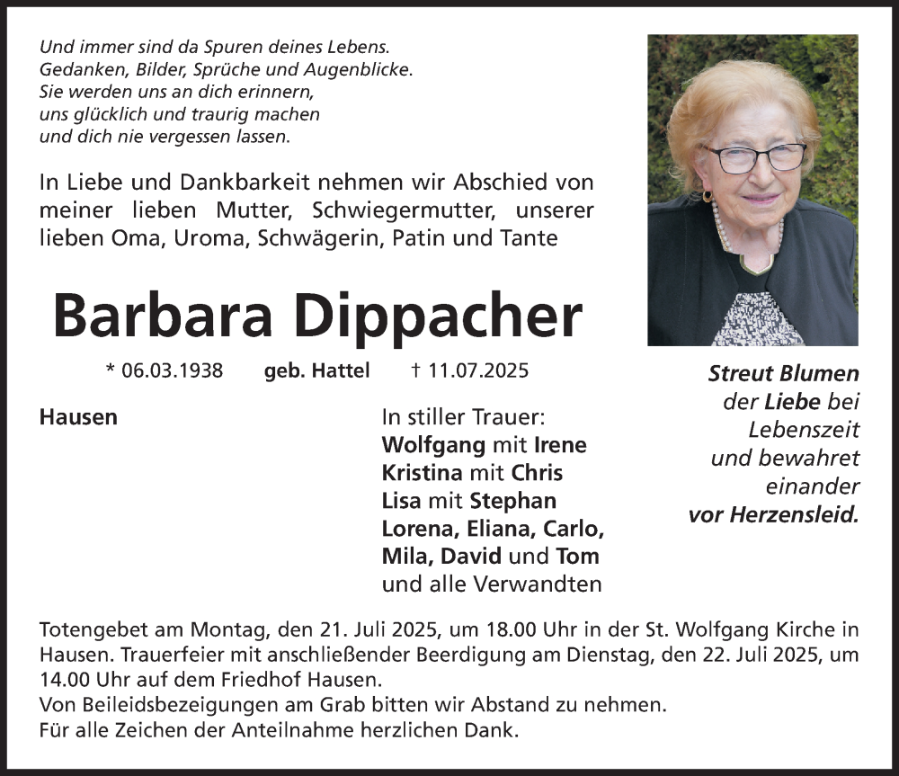 Hier finden Sie alle Traueranzeigen aus der Zeitung, die bisher für Barbara Dippacher erschienen sind. Weitere Traueranzeigen, die in der Zeitung erscheinen, werden hier ebenfalls aufgelistet