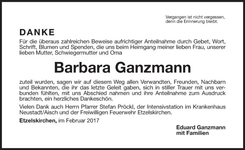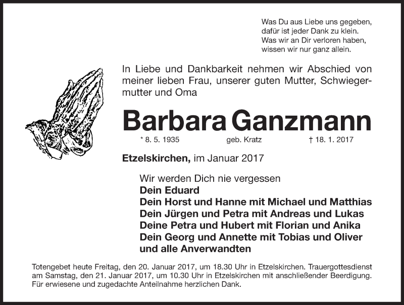 Hier finden Sie alle Traueranzeigen aus der Zeitung, die bisher für Barbara Ganzmann erschienen sind. Weitere Traueranzeigen, die in der Zeitung erscheinen, werden hier ebenfalls aufgelistet