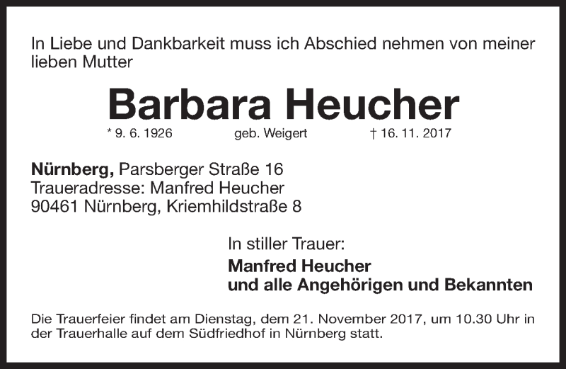 Hier finden Sie alle Traueranzeigen aus der Zeitung, die bisher für Barbara Heucher erschienen sind. Weitere Traueranzeigen, die in der Zeitung erscheinen, werden hier ebenfalls aufgelistet