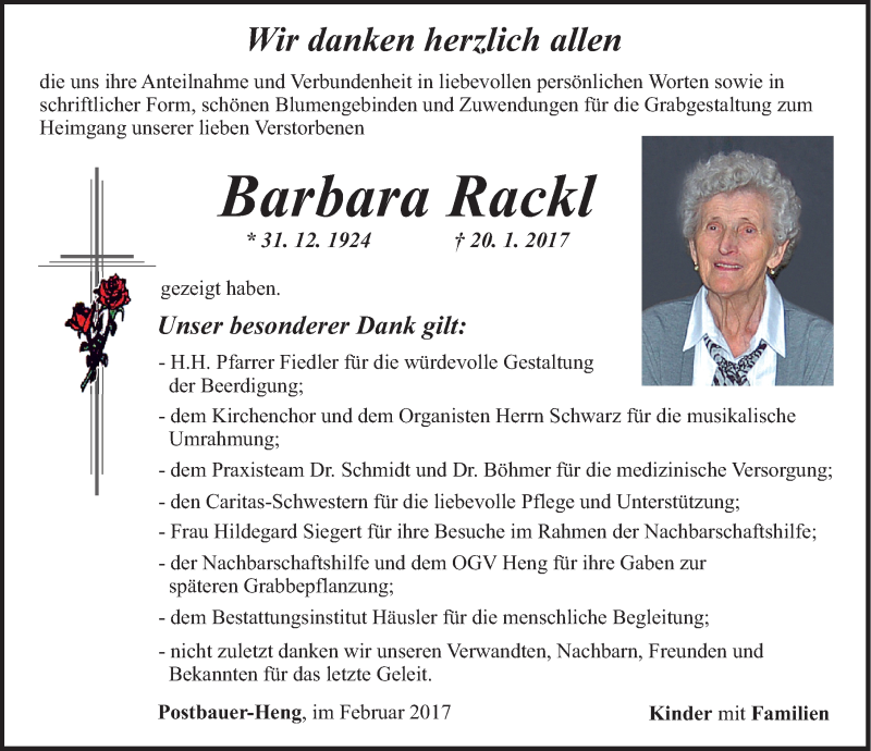 Hier finden Sie alle Traueranzeigen aus der Zeitung, die bisher für Barbara Rackl erschienen sind. Weitere Traueranzeigen, die in der Zeitung erscheinen, werden hier ebenfalls aufgelistet