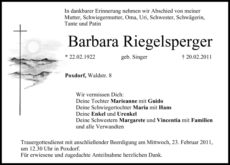 Hier finden Sie alle Traueranzeigen aus der Zeitung, die bisher für Barbara Riegelsperger erschienen sind. Weitere Traueranzeigen, die in der Zeitung erscheinen, werden hier ebenfalls aufgelistet
