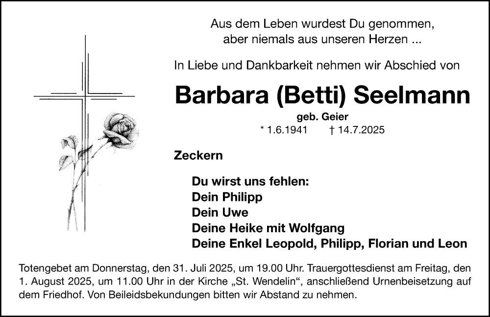 Hier finden Sie alle Traueranzeigen aus der Zeitung, die bisher für Barbara Seelmann erschienen sind. Weitere Traueranzeigen, die in der Zeitung erscheinen, werden hier ebenfalls aufgelistet