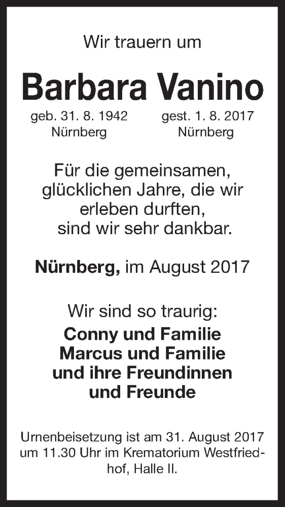 Hier finden Sie alle Traueranzeigen aus der Zeitung, die bisher für Barbara Vanino erschienen sind. Weitere Traueranzeigen, die in der Zeitung erscheinen, werden hier ebenfalls aufgelistet