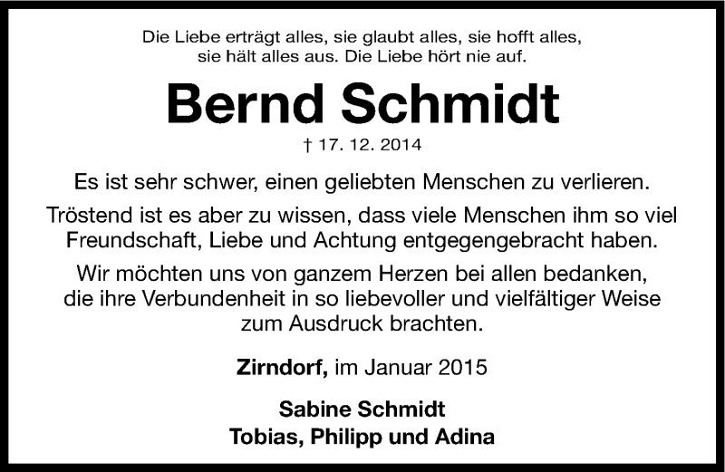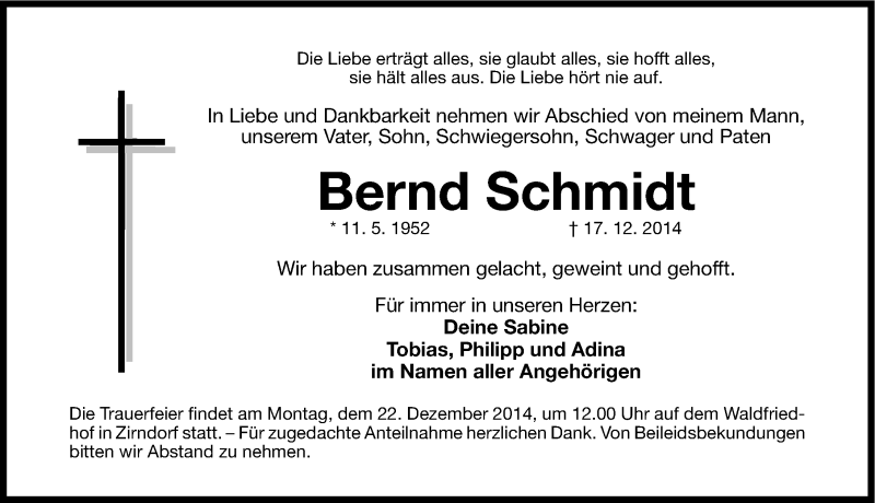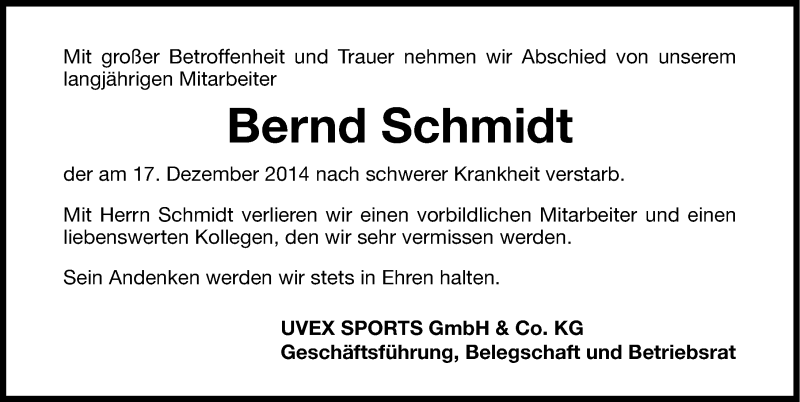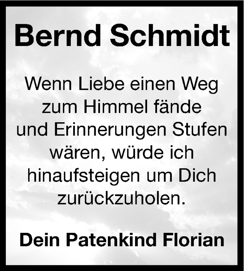 Hier finden Sie alle Traueranzeigen aus der Zeitung, die bisher für Bernd Schmidt erschienen sind. Weitere Traueranzeigen, die in der Zeitung erscheinen, werden hier ebenfalls aufgelistet