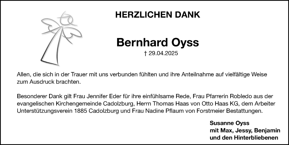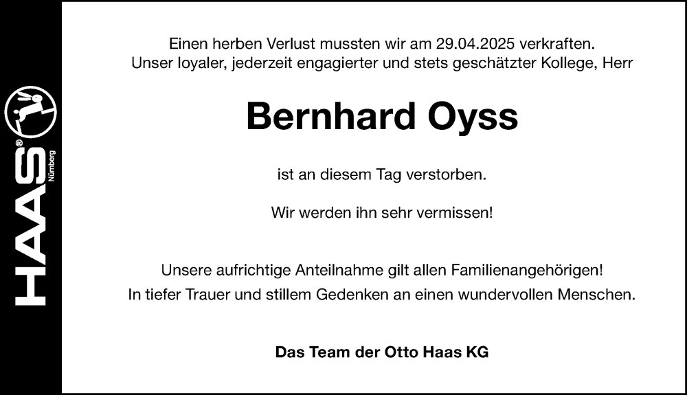 Hier finden Sie alle Traueranzeigen aus der Zeitung, die bisher für Bernhard Oyss erschienen sind. Weitere Traueranzeigen, die in der Zeitung erscheinen, werden hier ebenfalls aufgelistet