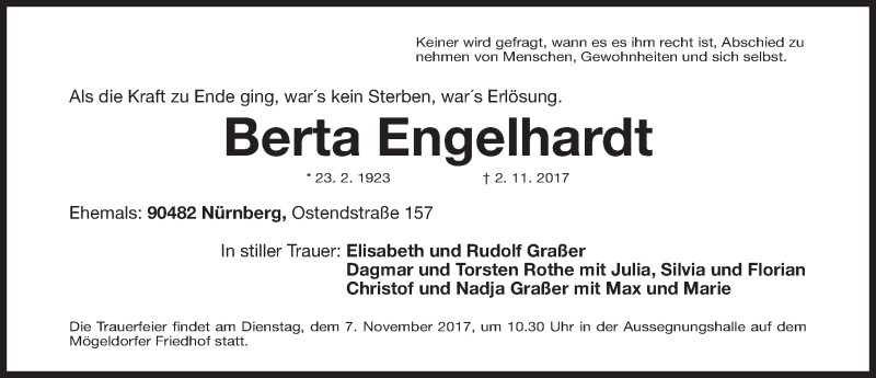 Hier finden Sie alle Traueranzeigen aus der Zeitung, die bisher für Berta Engelhardt erschienen sind. Weitere Traueranzeigen, die in der Zeitung erscheinen, werden hier ebenfalls aufgelistet
