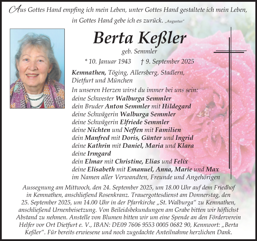 Hier finden Sie alle Traueranzeigen aus der Zeitung, die bisher für Berta Keßler erschienen sind. Weitere Traueranzeigen, die in der Zeitung erscheinen, werden hier ebenfalls aufgelistet
