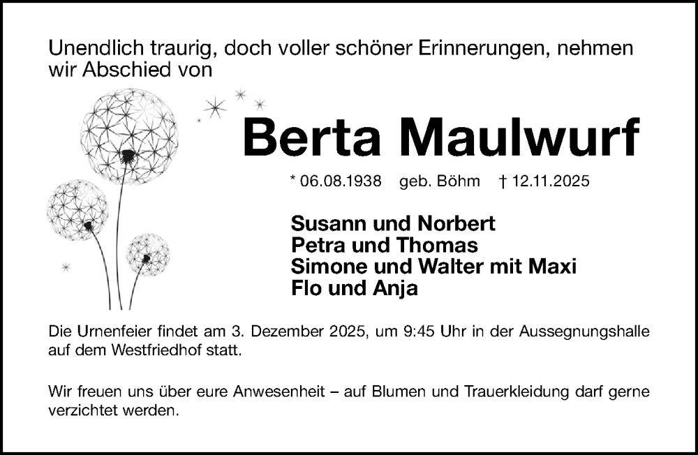Hier finden Sie alle Traueranzeigen aus der Zeitung, die bisher für Berta Maulwurf erschienen sind. Weitere Traueranzeigen, die in der Zeitung erscheinen, werden hier ebenfalls aufgelistet