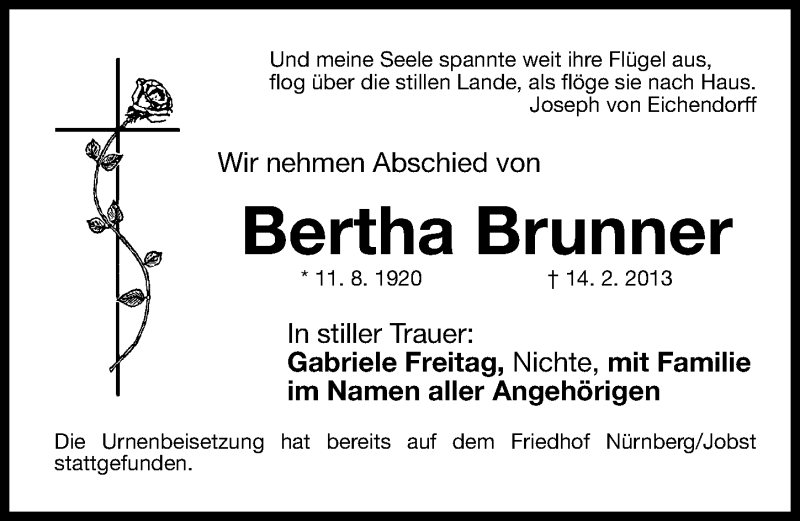 Hier finden Sie alle Traueranzeigen aus der Zeitung, die bisher für Bertha Brunner erschienen sind. Weitere Traueranzeigen, die in der Zeitung erscheinen, werden hier ebenfalls aufgelistet
