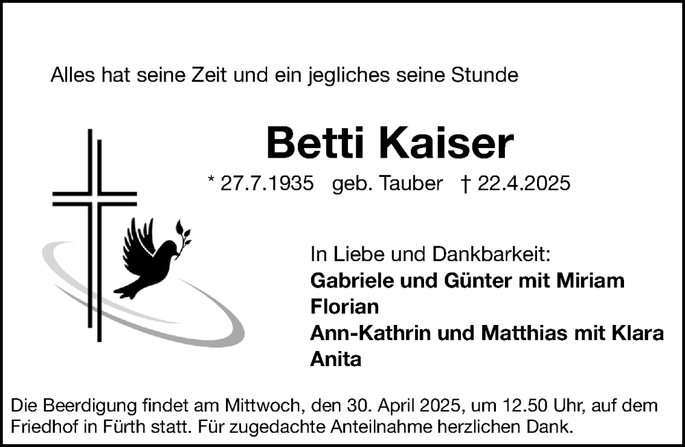 Hier finden Sie alle Traueranzeigen aus der Zeitung, die bisher für Betti Kaiser erschienen sind. Weitere Traueranzeigen, die in der Zeitung erscheinen, werden hier ebenfalls aufgelistet