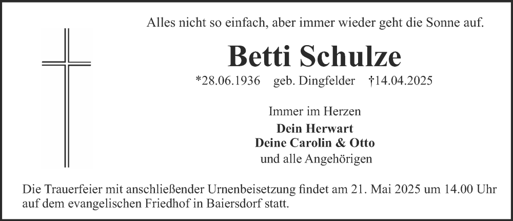 Hier finden Sie alle Traueranzeigen aus der Zeitung, die bisher für Betti Schulze erschienen sind. Weitere Traueranzeigen, die in der Zeitung erscheinen, werden hier ebenfalls aufgelistet