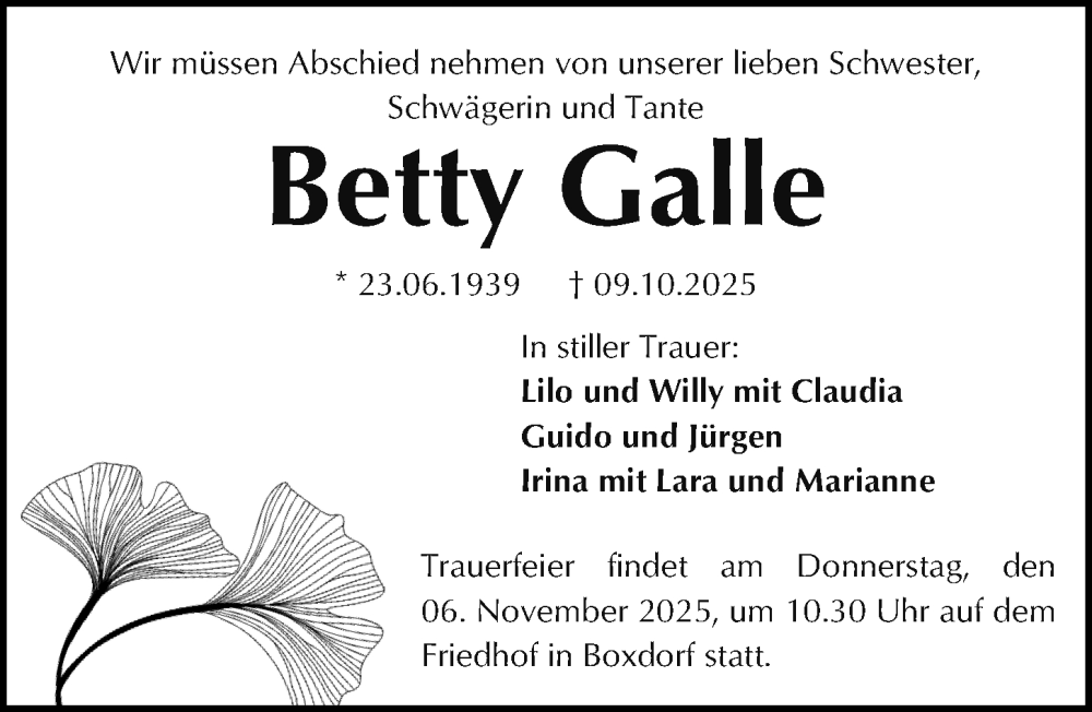 Hier finden Sie alle Traueranzeigen aus der Zeitung, die bisher für Betty Galle erschienen sind. Weitere Traueranzeigen, die in der Zeitung erscheinen, werden hier ebenfalls aufgelistet