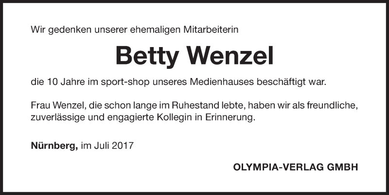 Hier finden Sie alle Traueranzeigen aus der Zeitung, die bisher für Betty Wenzel erschienen sind. Weitere Traueranzeigen, die in der Zeitung erscheinen, werden hier ebenfalls aufgelistet