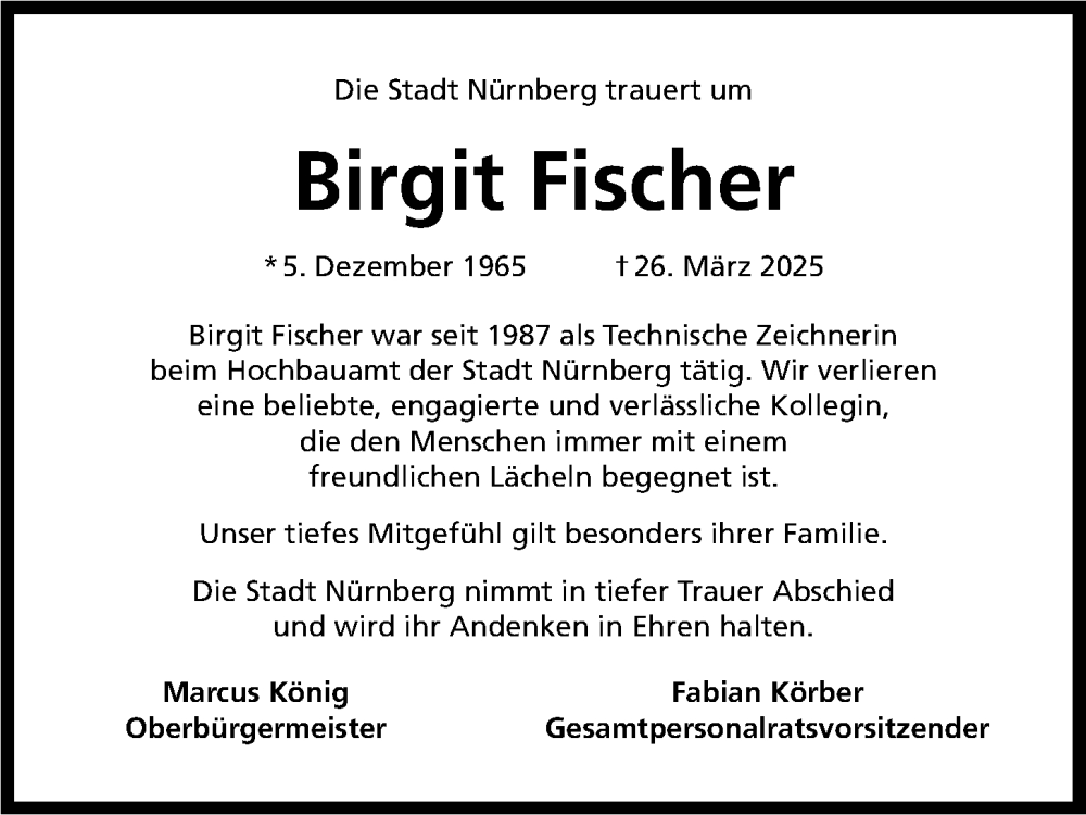 Hier finden Sie alle Traueranzeigen aus der Zeitung, die bisher für Birgit Fischer erschienen sind. Weitere Traueranzeigen, die in der Zeitung erscheinen, werden hier ebenfalls aufgelistet