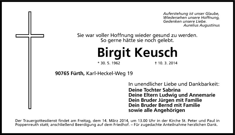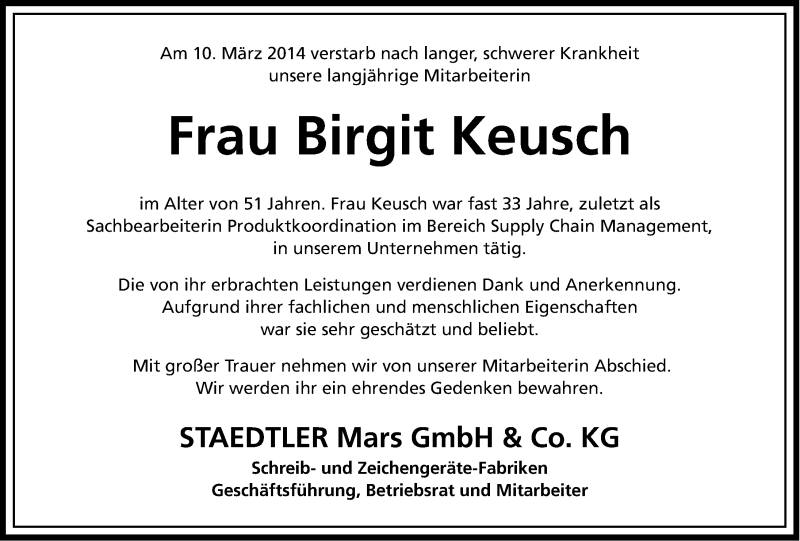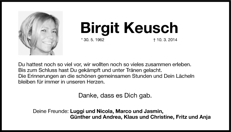 Hier finden Sie alle Traueranzeigen aus der Zeitung, die bisher für Birgit Keusch erschienen sind. Weitere Traueranzeigen, die in der Zeitung erscheinen, werden hier ebenfalls aufgelistet