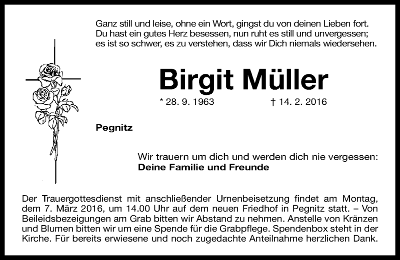 Hier finden Sie alle Traueranzeigen aus der Zeitung, die bisher für Birgit Müller erschienen sind. Weitere Traueranzeigen, die in der Zeitung erscheinen, werden hier ebenfalls aufgelistet