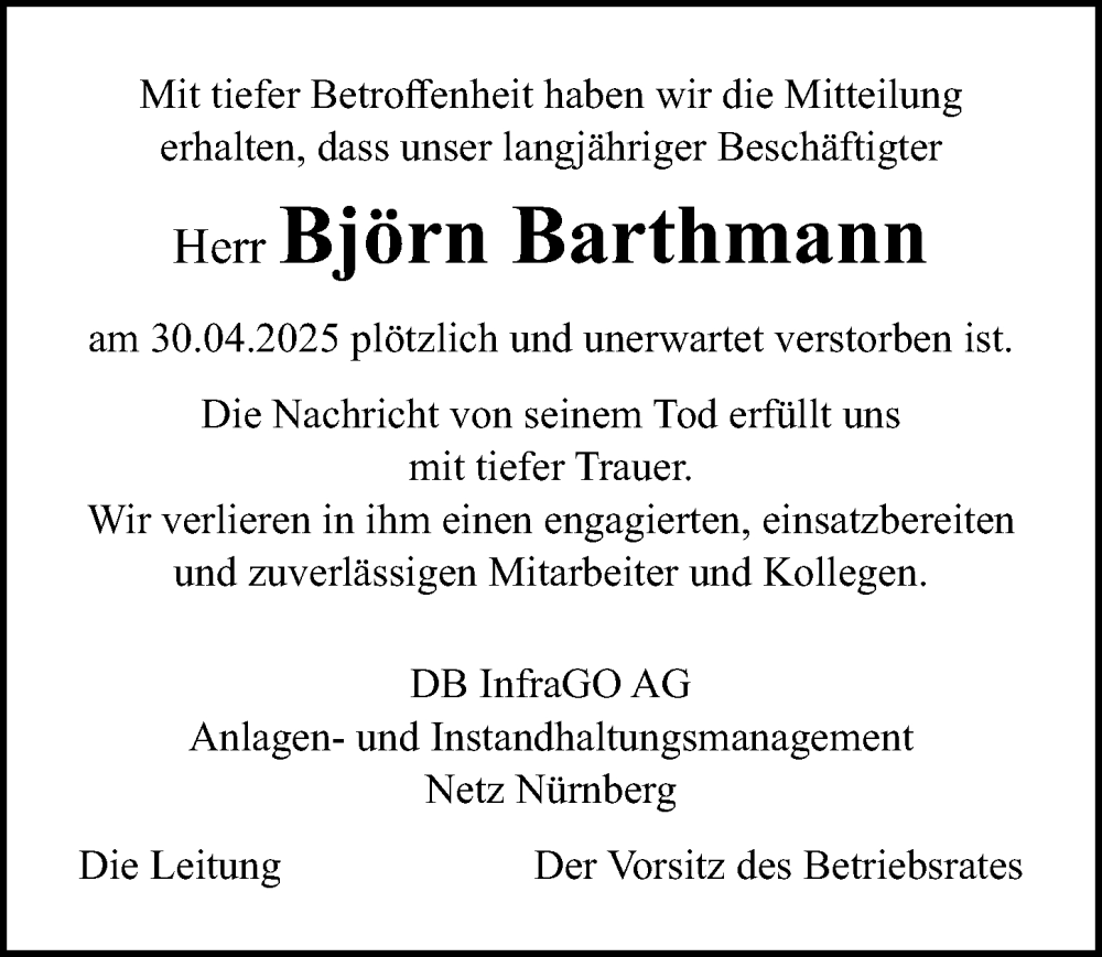 Hier finden Sie alle Traueranzeigen aus der Zeitung, die bisher für Björn Barthmann erschienen sind. Weitere Traueranzeigen, die in der Zeitung erscheinen, werden hier ebenfalls aufgelistet