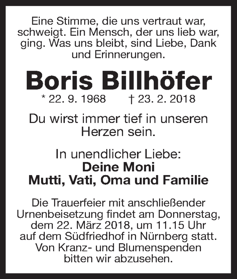 Hier finden Sie alle Traueranzeigen aus der Zeitung, die bisher für Boris Billhöfer erschienen sind. Weitere Traueranzeigen, die in der Zeitung erscheinen, werden hier ebenfalls aufgelistet