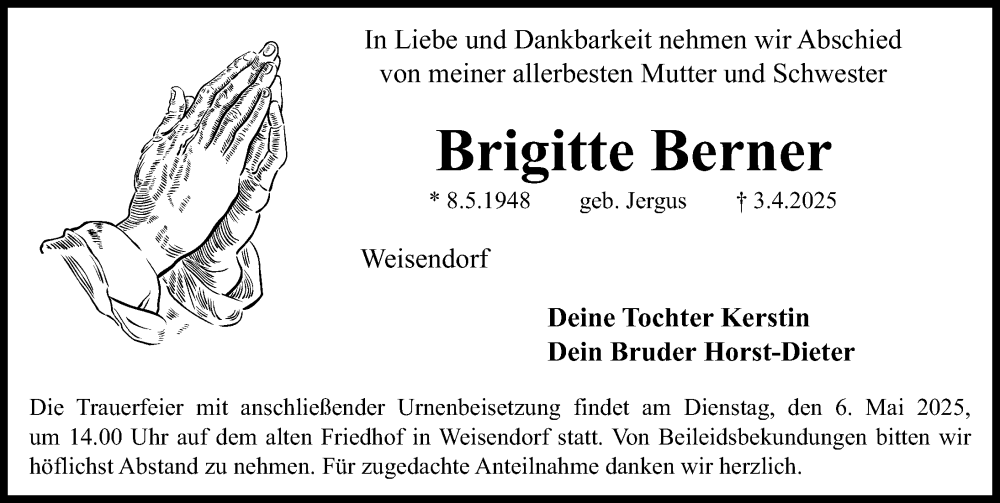 Hier finden Sie alle Traueranzeigen aus der Zeitung, die bisher für Brigitte Berner erschienen sind. Weitere Traueranzeigen, die in der Zeitung erscheinen, werden hier ebenfalls aufgelistet
