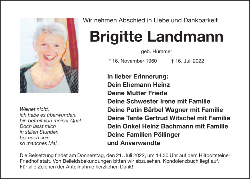 Hier finden Sie alle Traueranzeigen aus der Zeitung, die bisher für Brigitte Landmann erschienen sind. Weitere Traueranzeigen, die in der Zeitung erscheinen, werden hier ebenfalls aufgelistet
