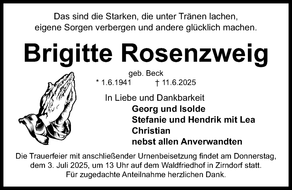Hier finden Sie alle Traueranzeigen aus der Zeitung, die bisher für Brigitte Rosenzweig erschienen sind. Weitere Traueranzeigen, die in der Zeitung erscheinen, werden hier ebenfalls aufgelistet