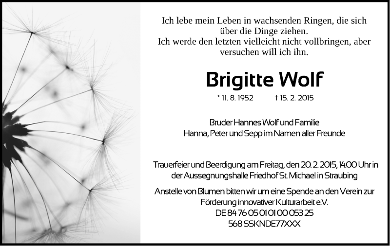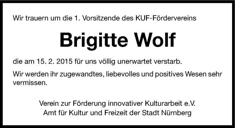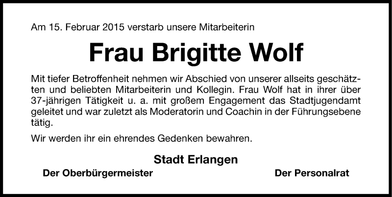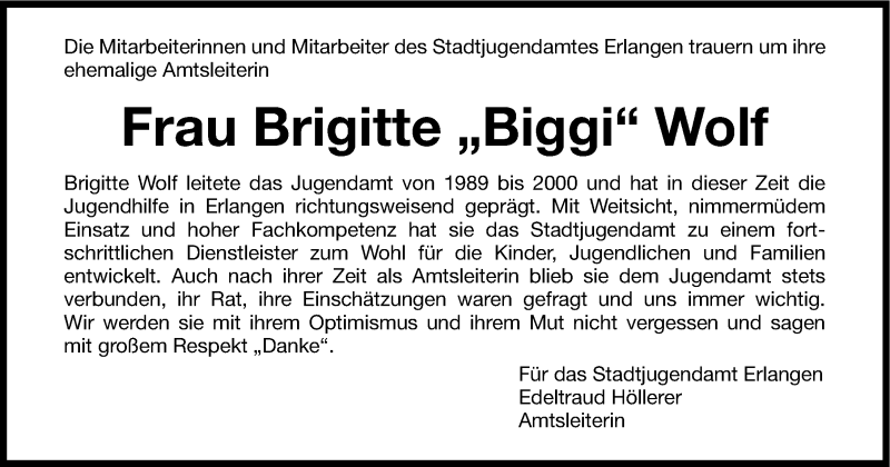 Hier finden Sie alle Traueranzeigen aus der Zeitung, die bisher für Brigitte Wolf erschienen sind. Weitere Traueranzeigen, die in der Zeitung erscheinen, werden hier ebenfalls aufgelistet