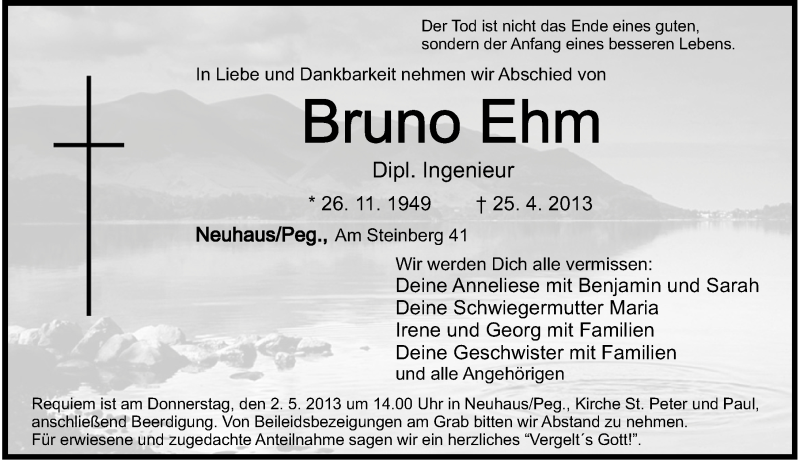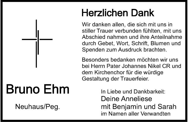 Hier finden Sie alle Traueranzeigen aus der Zeitung, die bisher für Bruno Ehm erschienen sind. Weitere Traueranzeigen, die in der Zeitung erscheinen, werden hier ebenfalls aufgelistet