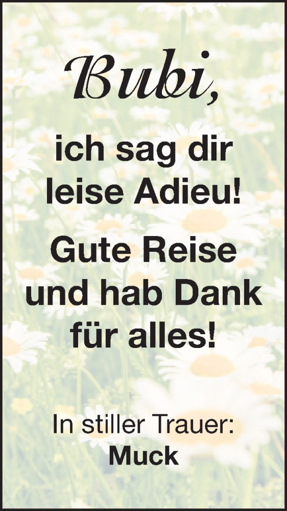 Hier finden Sie alle Traueranzeigen aus der Zeitung, die bisher für Bubi erschienen sind. Weitere Traueranzeigen, die in der Zeitung erscheinen, werden hier ebenfalls aufgelistet