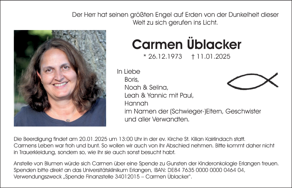 Hier finden Sie alle Traueranzeigen aus der Zeitung, die bisher für Carmen Üblacker erschienen sind. Weitere Traueranzeigen, die in der Zeitung erscheinen, werden hier ebenfalls aufgelistet