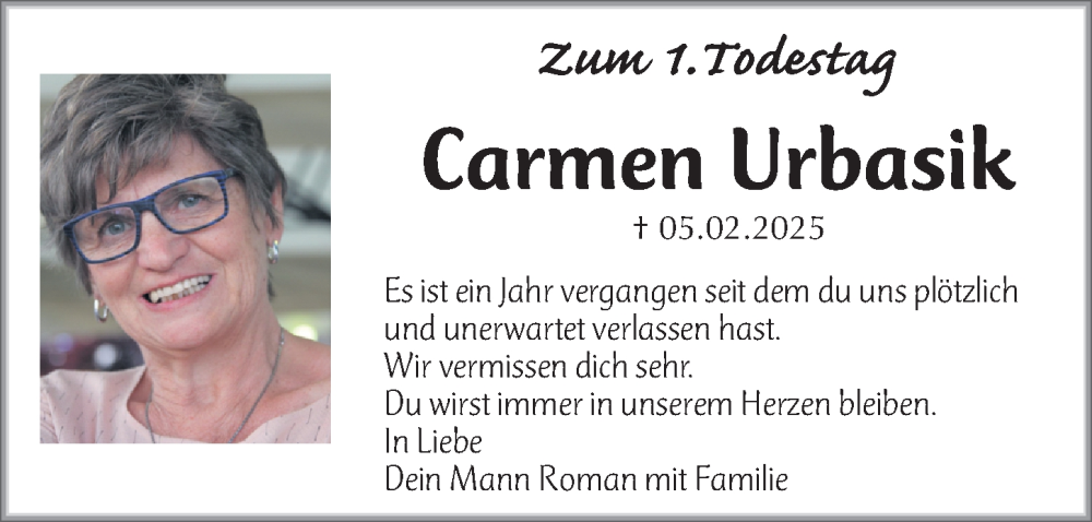Hier finden Sie alle Traueranzeigen aus der Zeitung, die bisher für Carmen Urbasik erschienen sind. Weitere Traueranzeigen, die in der Zeitung erscheinen, werden hier ebenfalls aufgelistet