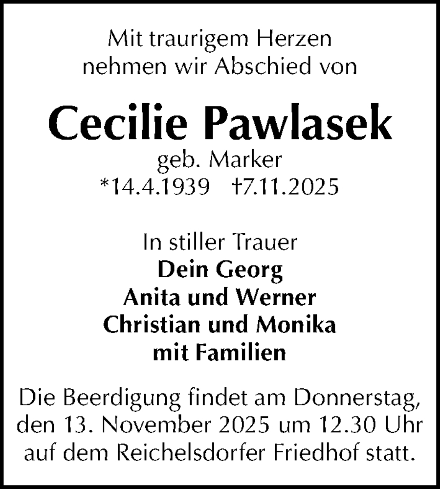 Hier finden Sie alle Traueranzeigen aus der Zeitung, die bisher für Cecilie Pawlasek erschienen sind. Weitere Traueranzeigen, die in der Zeitung erscheinen, werden hier ebenfalls aufgelistet