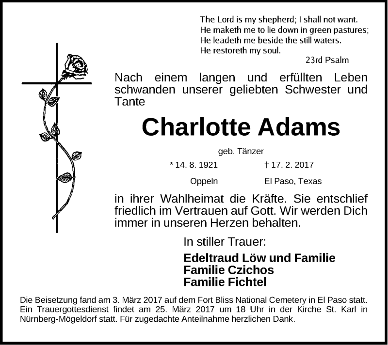 Hier finden Sie alle Traueranzeigen aus der Zeitung, die bisher für Charlotte Adams erschienen sind. Weitere Traueranzeigen, die in der Zeitung erscheinen, werden hier ebenfalls aufgelistet