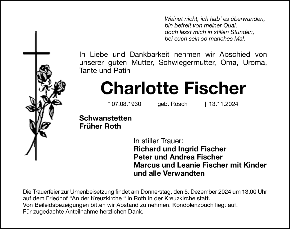 Hier finden Sie alle Traueranzeigen aus der Zeitung, die bisher für Charlotte Fischer erschienen sind. Weitere Traueranzeigen, die in der Zeitung erscheinen, werden hier ebenfalls aufgelistet