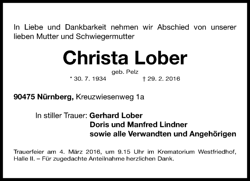 Hier finden Sie alle Traueranzeigen aus der Zeitung, die bisher für Christa Lober erschienen sind. Weitere Traueranzeigen, die in der Zeitung erscheinen, werden hier ebenfalls aufgelistet