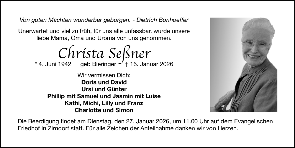 Hier finden Sie alle Traueranzeigen aus der Zeitung, die bisher für Christa Seßner erschienen sind. Weitere Traueranzeigen, die in der Zeitung erscheinen, werden hier ebenfalls aufgelistet