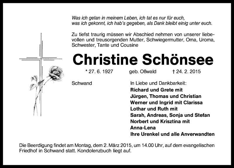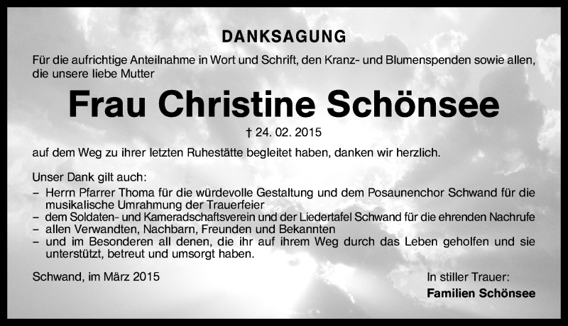 Hier finden Sie alle Traueranzeigen aus der Zeitung, die bisher für Christine Schönsee erschienen sind. Weitere Traueranzeigen, die in der Zeitung erscheinen, werden hier ebenfalls aufgelistet