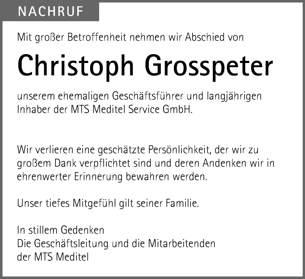 Hier finden Sie alle Traueranzeigen aus der Zeitung, die bisher für Christoph Grosspeter erschienen sind. Weitere Traueranzeigen, die in der Zeitung erscheinen, werden hier ebenfalls aufgelistet