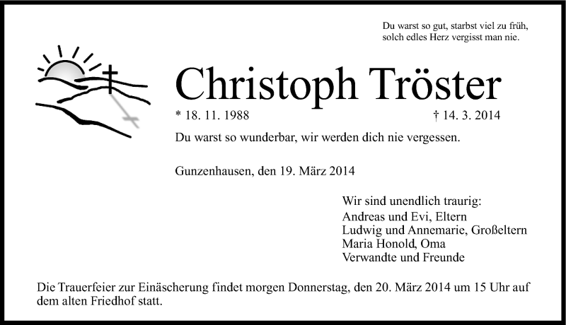 Hier finden Sie alle Traueranzeigen aus der Zeitung, die bisher für Christoph Tröster erschienen sind. Weitere Traueranzeigen, die in der Zeitung erscheinen, werden hier ebenfalls aufgelistet