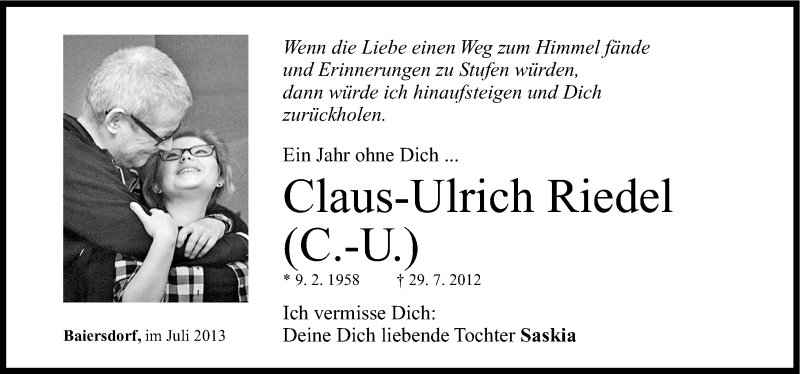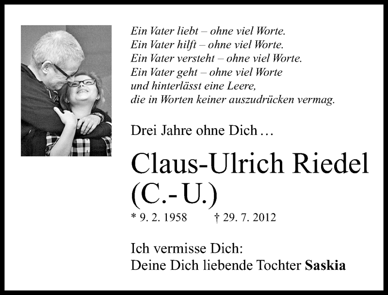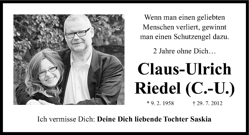 Hier finden Sie alle Traueranzeigen aus der Zeitung, die bisher für Claus-Ulrich Riedel erschienen sind. Weitere Traueranzeigen, die in der Zeitung erscheinen, werden hier ebenfalls aufgelistet