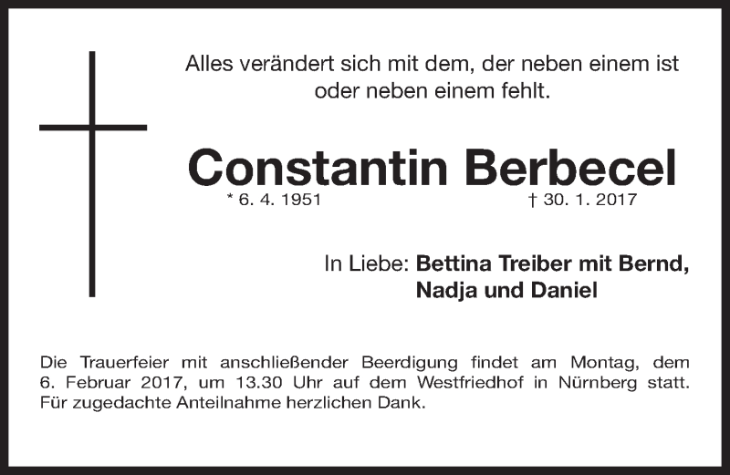 Hier finden Sie alle Traueranzeigen aus der Zeitung, die bisher für Constantin Berbecel erschienen sind. Weitere Traueranzeigen, die in der Zeitung erscheinen, werden hier ebenfalls aufgelistet