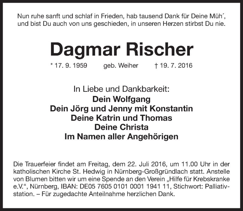 Hier finden Sie alle Traueranzeigen aus der Zeitung, die bisher für Dagmar Rischer erschienen sind. Weitere Traueranzeigen, die in der Zeitung erscheinen, werden hier ebenfalls aufgelistet