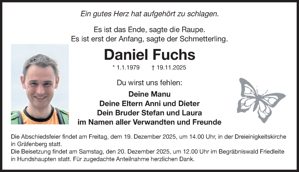 Hier finden Sie alle Traueranzeigen aus der Zeitung, die bisher für Daniel Fuchs erschienen sind. Weitere Traueranzeigen, die in der Zeitung erscheinen, werden hier ebenfalls aufgelistet