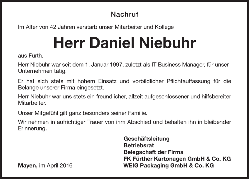 Hier finden Sie alle Traueranzeigen aus der Zeitung, die bisher für Daniel Niebuhr erschienen sind. Weitere Traueranzeigen, die in der Zeitung erscheinen, werden hier ebenfalls aufgelistet