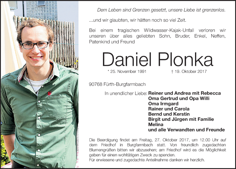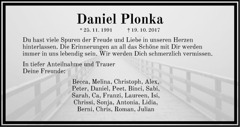 Hier finden Sie alle Traueranzeigen aus der Zeitung, die bisher für Daniel Plonka erschienen sind. Weitere Traueranzeigen, die in der Zeitung erscheinen, werden hier ebenfalls aufgelistet